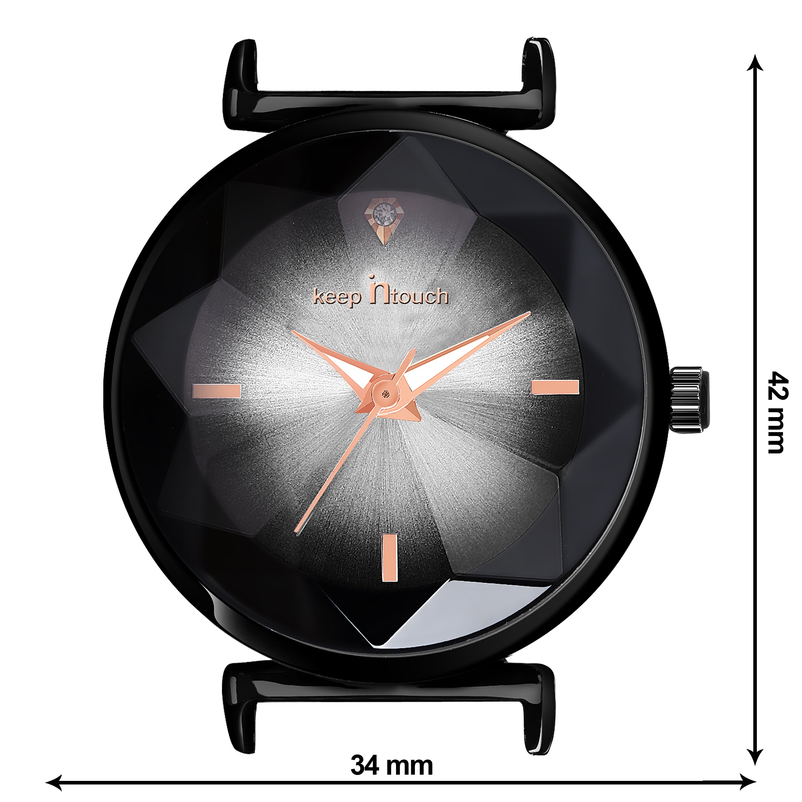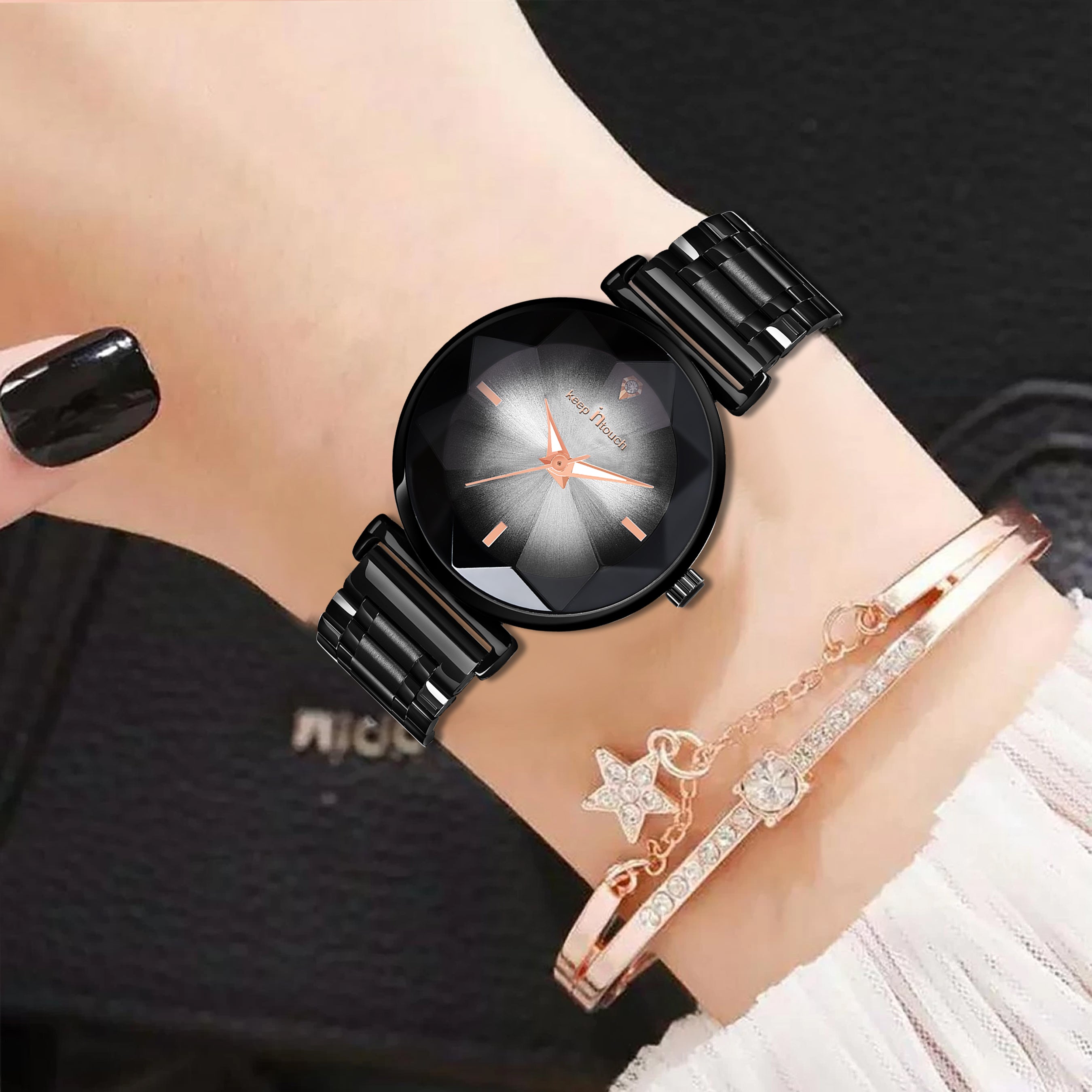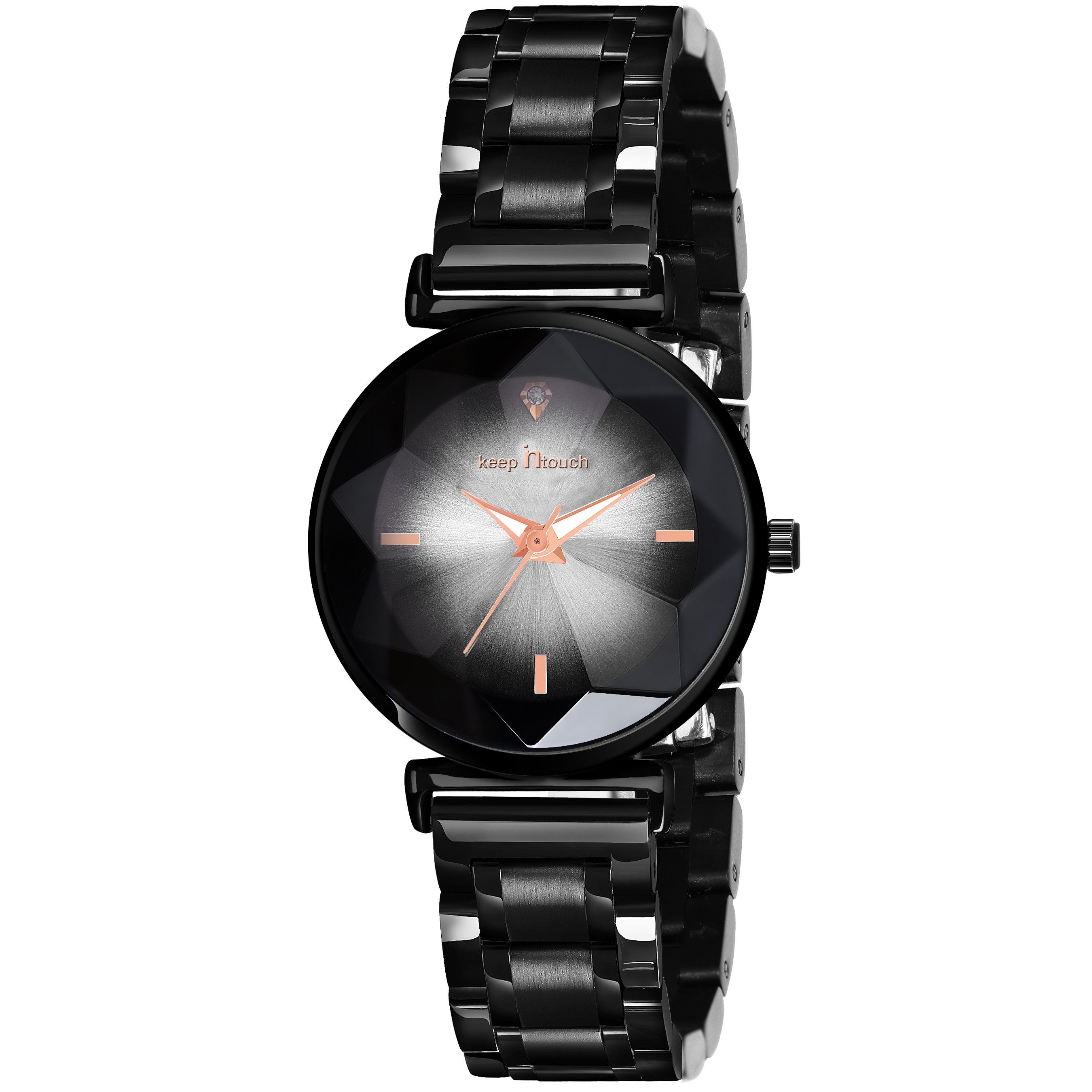Add sophistication to your style with the Keep in Touch Analog Women's Watch, featuring a black dial with a crystal accent and a sleek black metal strap. The rose-gold hands enhance its elegant appearance, while the Quartz movement guarantees precision. Designed for comfort and charm, this timepiece perfectly complements both casual and formal looks.
