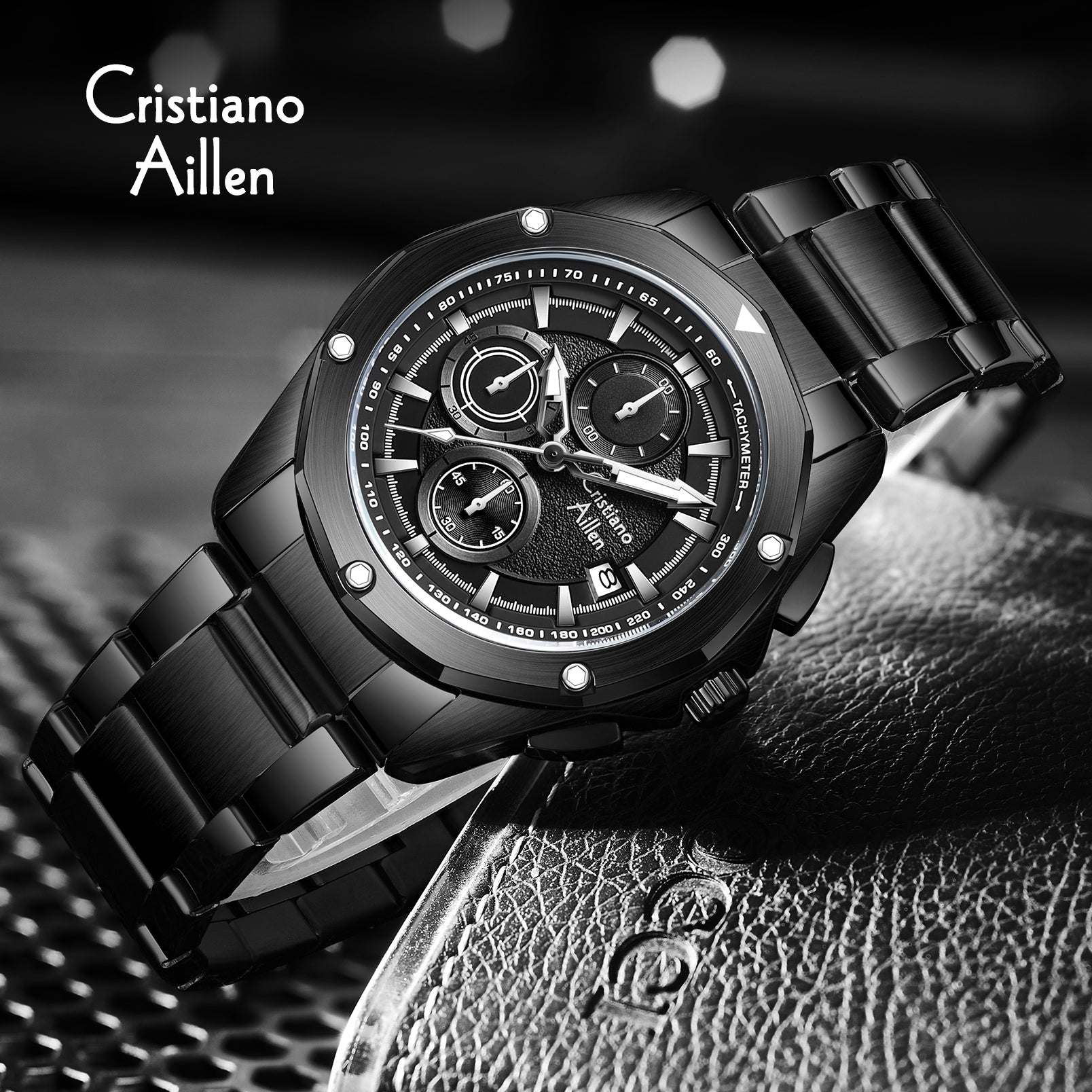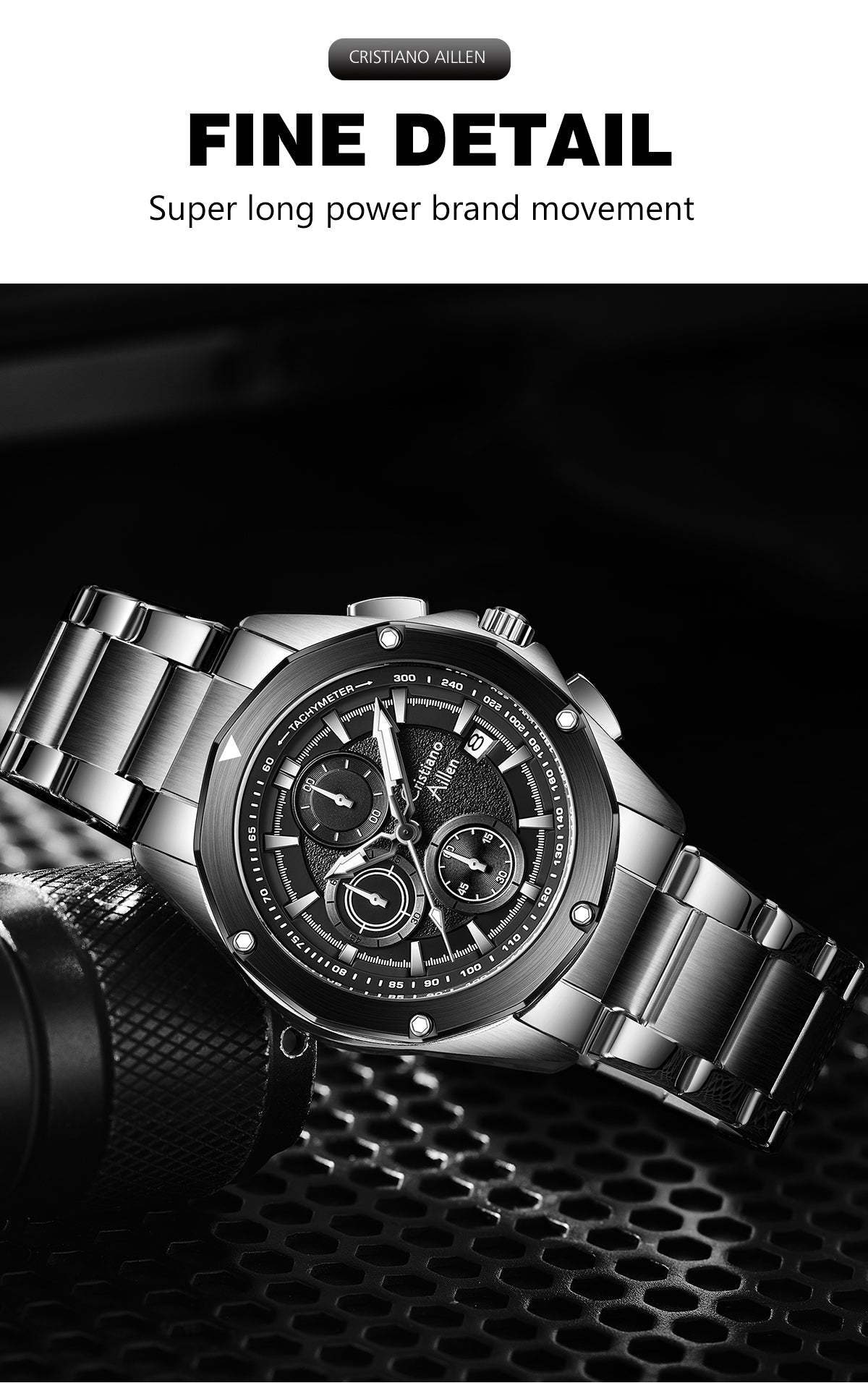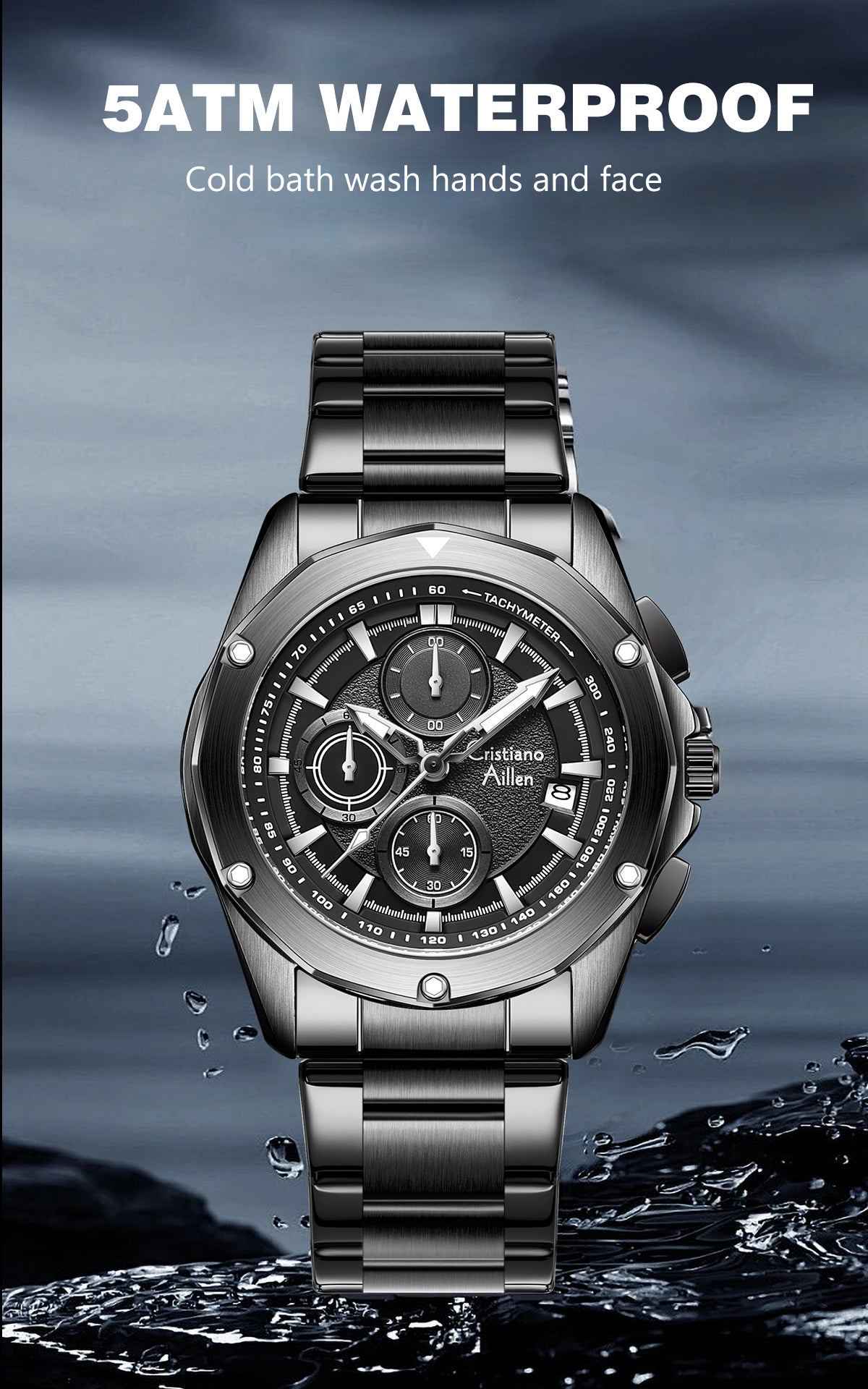 The Cristiano Aillen Chronograph – Model CA-8899 is a fusion of sporty elegance and advanced functionality. Crafted in full black stainless steel with a bold tachymeter bezel, this watch is designed for men who value both performance and style. Featuring a 47mm oversized dial, chronograph stopwatch function, and date display, it ensures practicality while making a strong fashion statement. The quartz movement guarantees precision, while scratch-resistant mineral glass and 10 ATM water resistance add durability. Whether you’re in a business meeting, casual outing, or outdoor adventure, the CA-8899 is your perfect wrist companion.