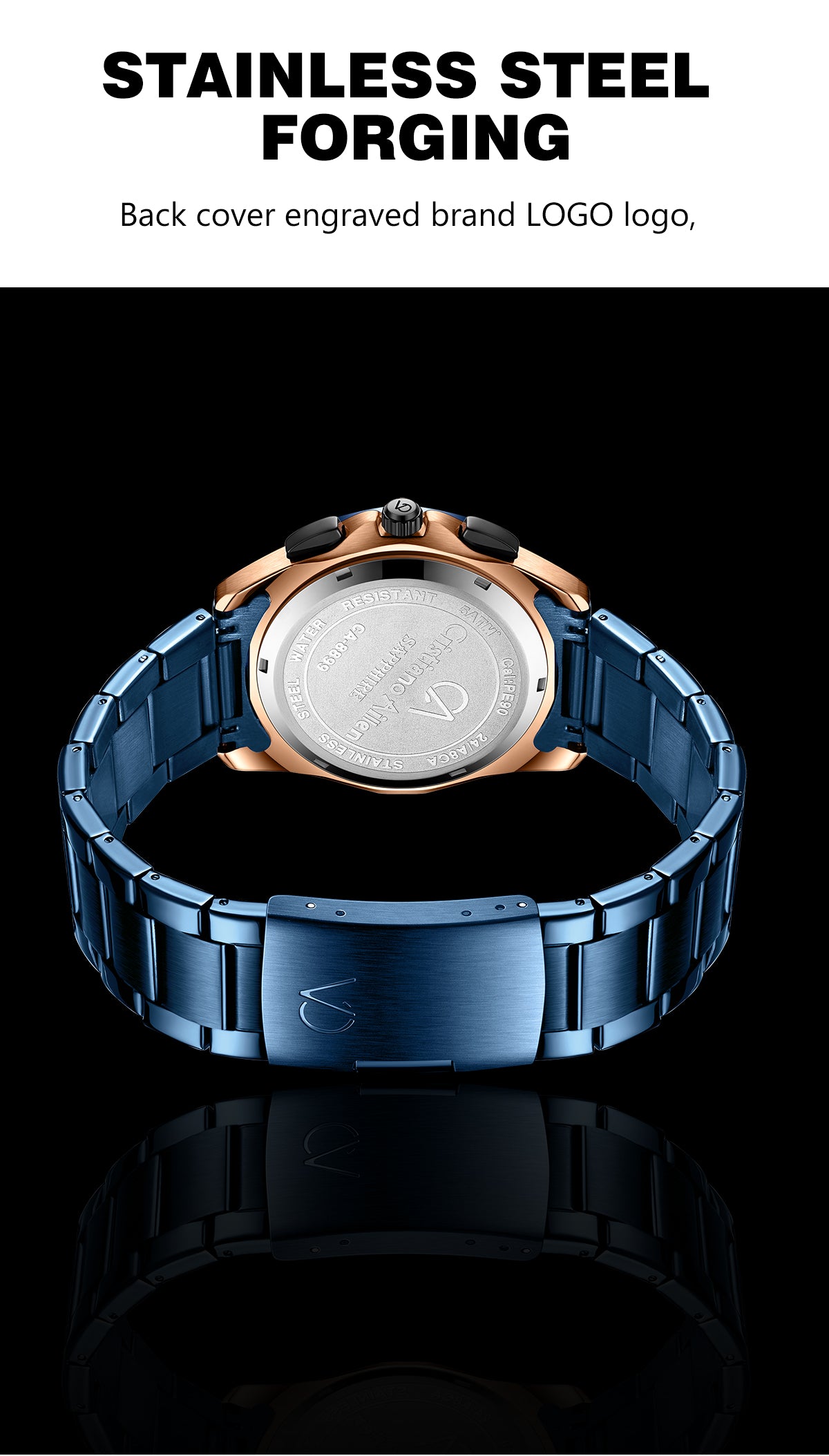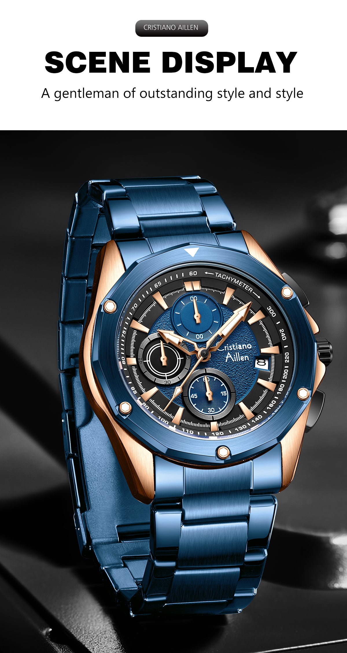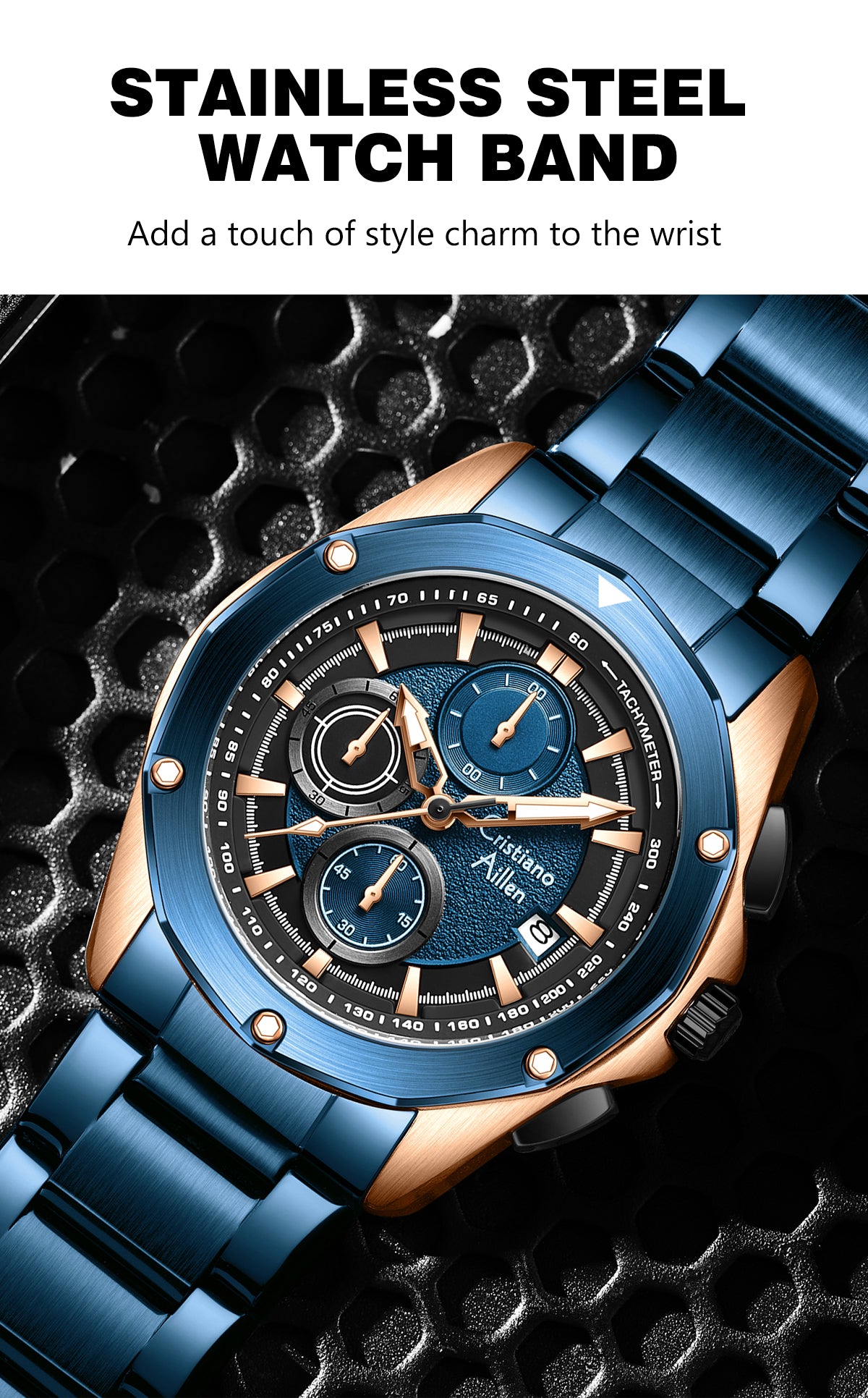 The Cristiano Aillen Chronograph – Model CA-8899 is a fusion of sporty elegance and advanced functionality. Crafted in full black stainless steel with a bold tachymeter bezel, this watch is designed for men who value both performance and style. Featuring a 47mm oversized dial, chronograph stopwatch function, and date display, it ensures practicality while making a strong fashion statement. The quartz movement guarantees precision, while scratch-resistant mineral glass and 10 ATM water resistance add durability. Whether you’re in a business meeting, casual outing, or outdoor adventure, the CA-8899 is your perfect wrist companion.